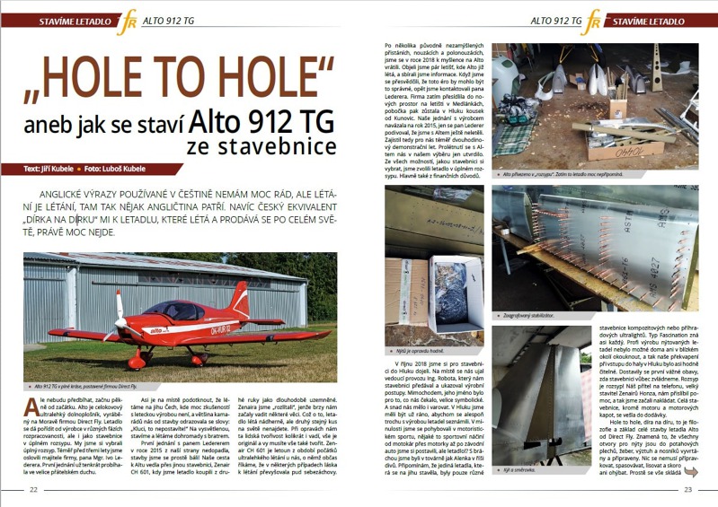 Flying Revue 3/2019 Postavte si letadlo. To je výzva, nad kterou leckdo mávne rukou, leckdo zahoří. Bratři Kubelovi patří k těm druhým a letadlo, konkrétně Alto 912 TG, si pořídili jako stavebnici. Jak se jim montáž letadla ze stavebnice daří?