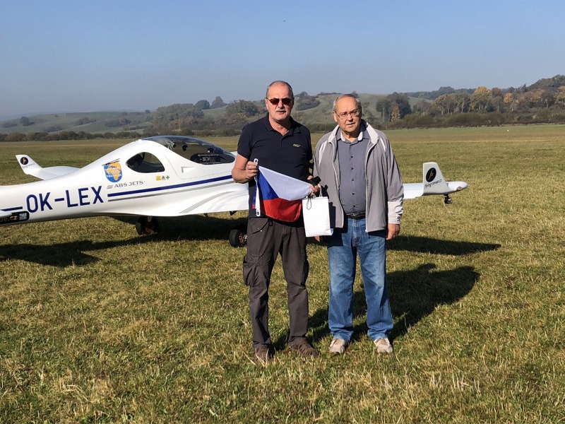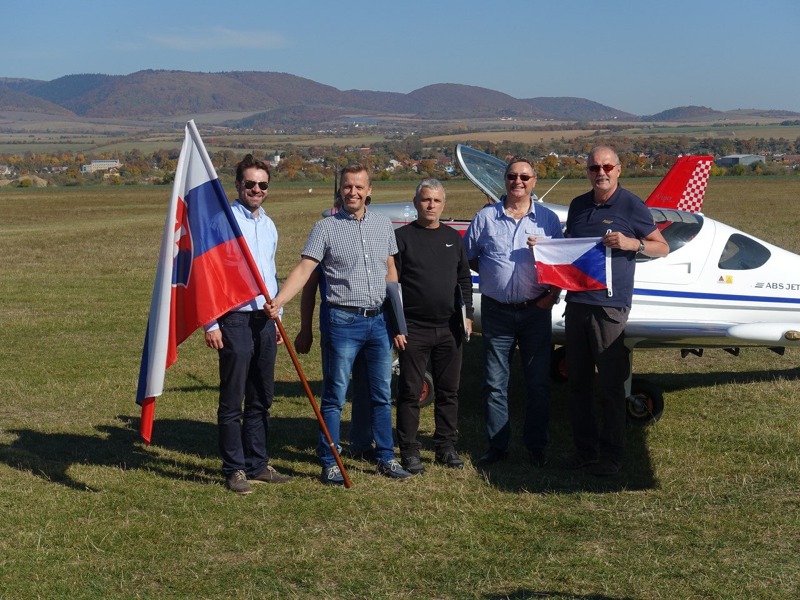 Po dvou a půl hodinovém letu z Příbrami a odhlášení se z TMA TATRY, výstupní bod Spišský hrad, jsme přistáli na travnaté dráze 16 v Ražňanech, kde právě na okruhu zalétávali ultralehké letadlo Skyper, vyráběné firmou Tomark. Otec a syn Tomkové, majitelé této firmy nás zde společně s předsedou místního Aeroklubu panem Lipjancem vřele uvítali a po předání pamětních listů ČsL a FR s námi i ochotně zapózovali před fotoaparátem. Abychom celému aktu dodali “mezinárodní “ punc, zvěčnili jsme se ve společnosti slovenské a české vlajky, kde bohužel českou vlajku držím nějak opačně. S výrobky firmy Tomark vás brzy seznámíme podrobněji na stránkách rozšířeného časopisu Flying Revue.