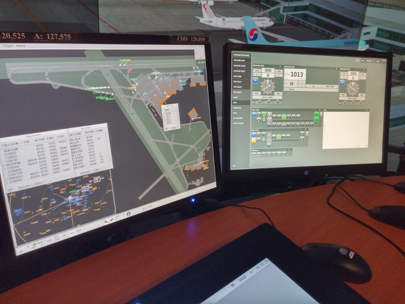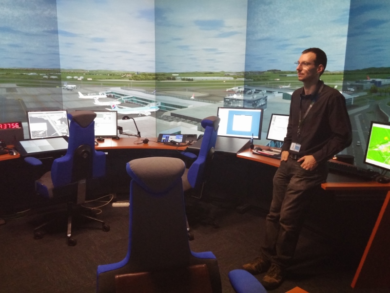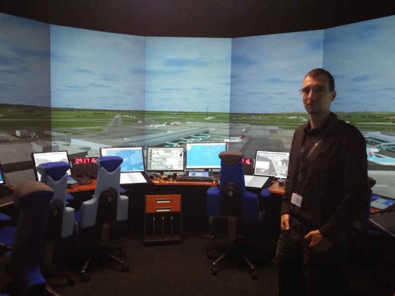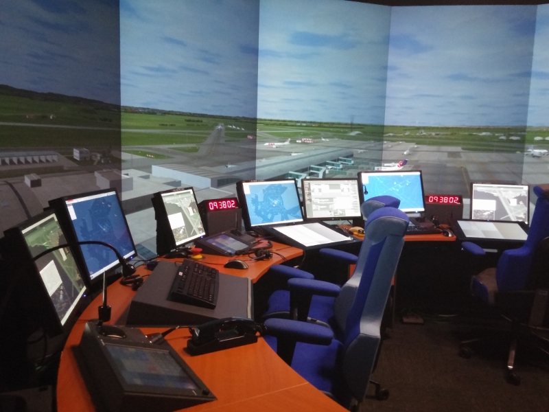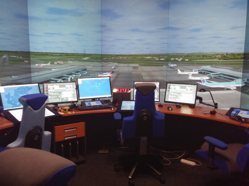 V simulátoru je všechno dokonale jako doopravdy. V místnosti bez oken o rozměrech zhruba deset krát deset metrů vidíme do kruhu uspořádaný stůl a židle řídících přesně tak, jako je to na skutečné věži, vzdálené jen pár set metrů odsud. Také všechny systémy jsou stejné jako v živém provozu na věži. Stejný hardware, stejný software, jen data o pozicích letadel či počasí sem posílá čtyřicítka počítačů podle navolených parametrů.