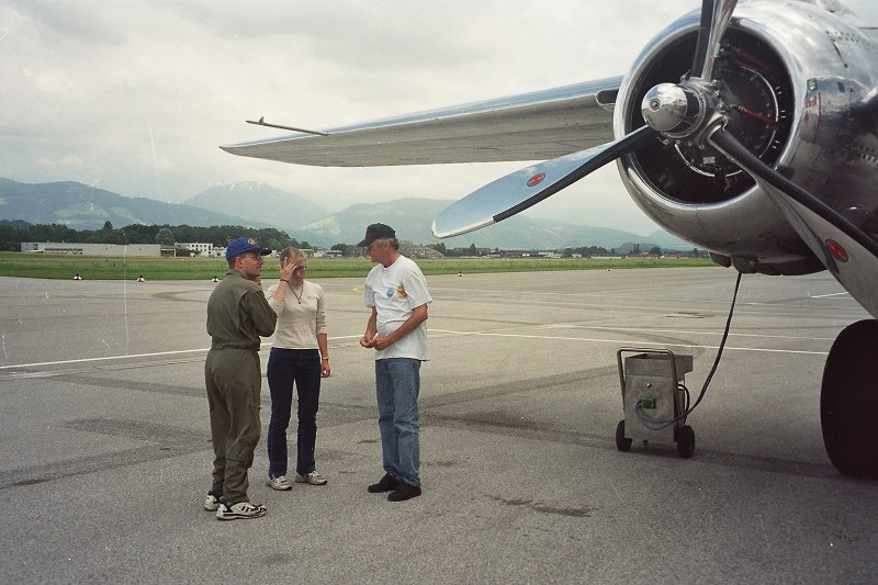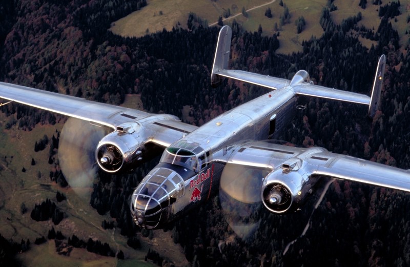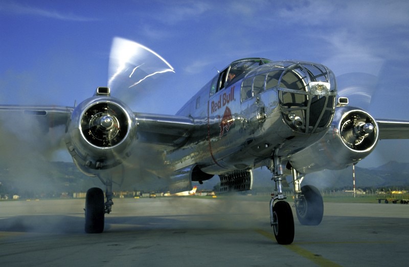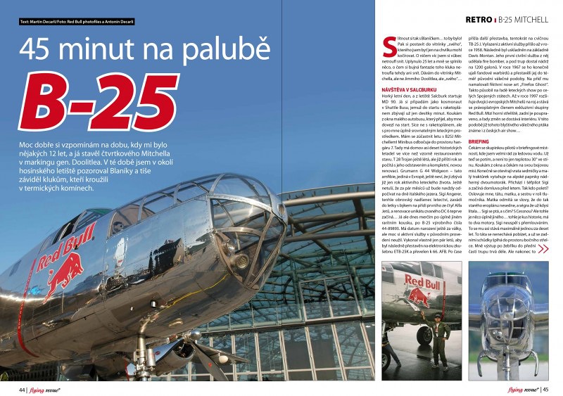 Horký letní den, a z letiště Salcburk startuje MD 90. Já si připadám jako kosmonaut v Shuttle Busu, jemuž do startu s raketoplánem zbývají už jen desítky minut. Koukám z okna malého autobusu, který přijel, aby mne dovezl na start. Sice ne s raketoplánem, ale s pro mne úplně srovnatelným leteckým prostředkem. Mám se zúčastnit letu s B25J Mitchellem! Minibus odbočuje do prostoru hangáru 7. Tady má domov asi deset historických letadel ve více než vzorně restaurovaném stavu. T 28 Trojan ještě létá, ale již příští rok se počítá s jeho odstavením a kompletní, novou renovací. Grumann G 44 Widgeon – tato amfibie, jediná v Evropě, ještě neví, že jí zbývá již jen rok aktivního leteckého života. Ještě netuší, že za pár měsíců už bude navždy odpočívat na dně italského jezera. Sigi Angerer, tenhle obrovský nadšenec letectví, zavádí do letky s býkem na přídi prvního ze čtyř Alfa Jetů, a renovace unikátu zvaného DC 6 teprve začíná… Já ale dnes merčím po úplně jiném raritním kousku, po B-25 výrobního čísla 44–89893. Má datum narození ještě za války, ale moc si aktivní služby v původním provedení neužil. Vykonal vlastně jen pár letů, aby byl následně přestavěn na elektronickou zkušebnu ETB-25K a převelen k 66. AFB. Po čase přišla další přestavba, tentokrát na cvičnou TB-25 J. Vyřazení z aktivní služby přišlo až v roce 1958. Následně byl uskladněn na základně Davis Montan. Jeho první civilní služba z něj udělala fire bomber, a pod trup dostal nádrž na 1200 galonů. V roce 1967 se ho konečně ujali fandové warbirdů a přestavěli jej do téměř původní válečné podoby. Na příď mu namalovali fiktivní nose art „Firefox Ghost“. Takto působil na řadě leteckých show po celých Spojených státech. Až v roce 1997 rozšiřuje dvojici evropských Mitchelů na roj a stává se právoplatným členem exkluzivní skupiny Red Bull. Mizí horní střeliště, zadní je poupraveno, a řady změn se dostává interiéru. V této podobě již tohoto blyštivého válečného ptáka známe i z českých air show…