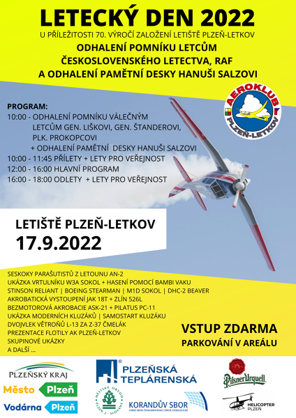 Krom leteckého a doprovodného programu se můžete těšit již od 10:00 hodin na odhalení pomníku gen. Liškovi, gen. Štanderovi a plk. Prokopcovi, čestnému předsedovi a čestným členům našeho Aeroklubu, stíhacím letcům Československého letectva a RAF, kteří s námi až do vysokého věku létali! Bude odhalena i pamětní deska Hanuši Salzovi, našemu čestnému členovi, autorovi dvou dílů knihy Letectví a město Plzeň, členovi Korandova sboru.