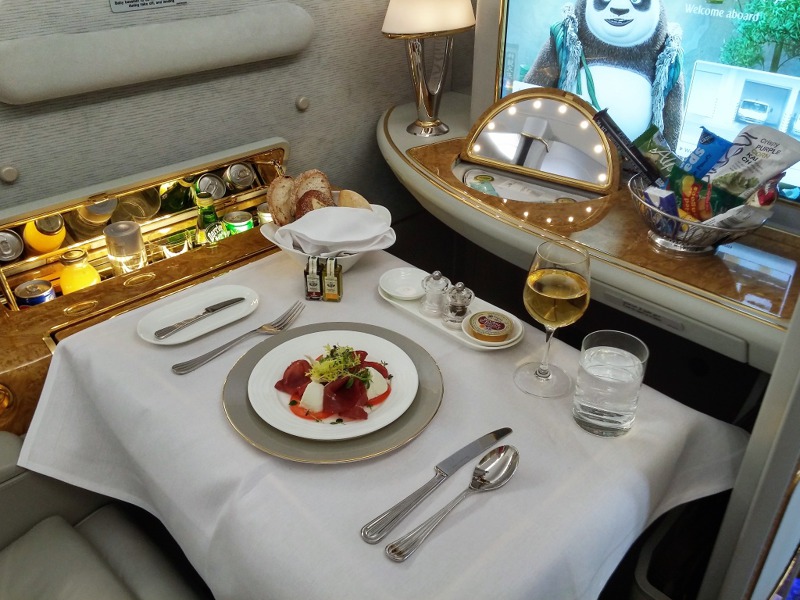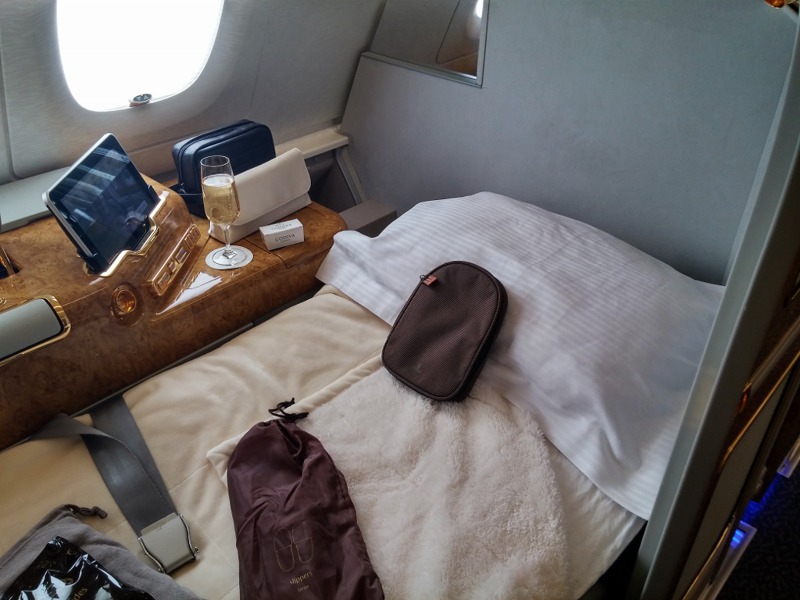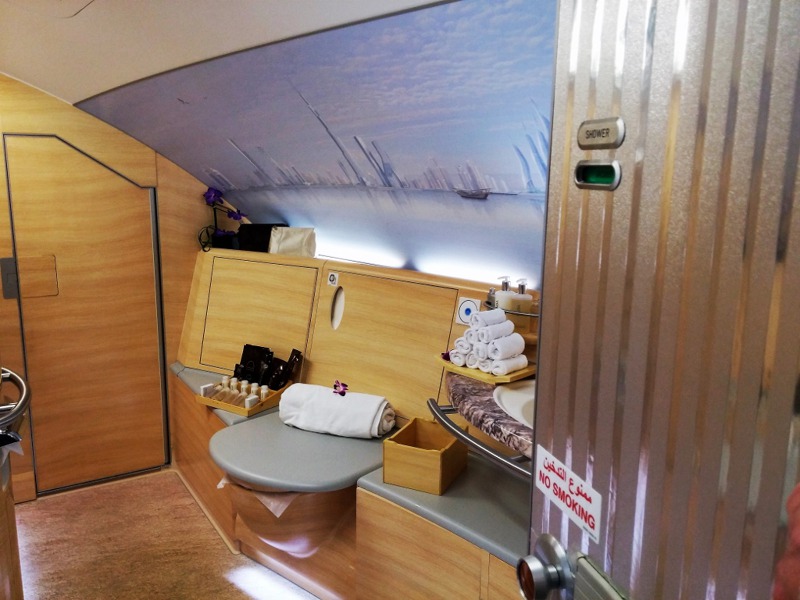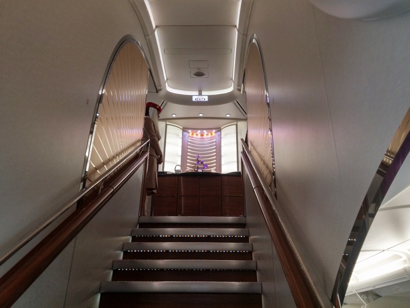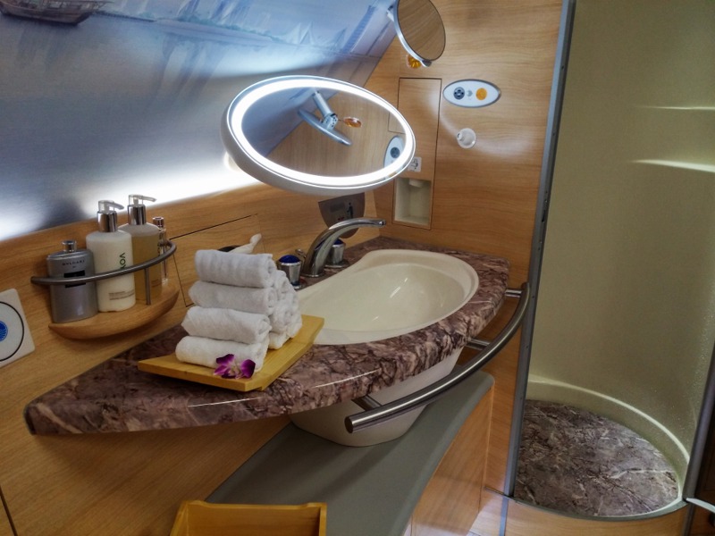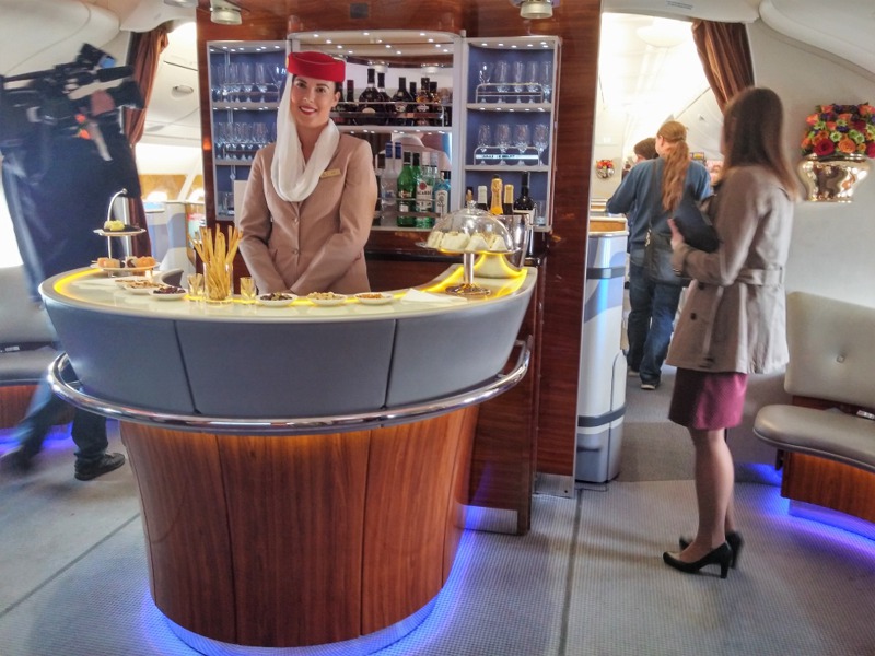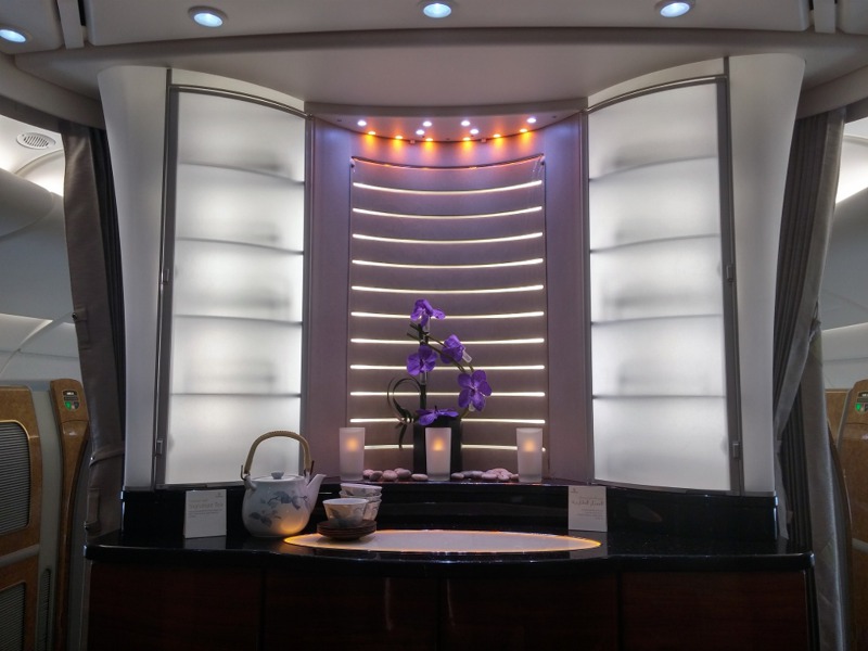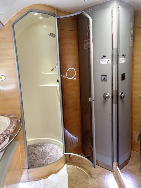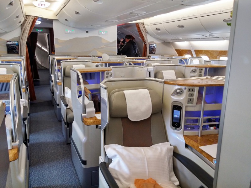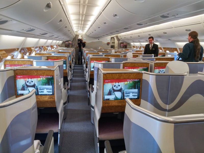 V bussines třídě má každý z 76 pasažérů vcelku slušnou dávku soukromí na kompletně polohovatelném sedadle. Cestující v první třídě mají ve svých boxech k dispozici regulérní stůl s jídelním servisem či sice stísněné, leč na odpočinek za letu docela postačující lůžko, přičemž před ulehnutím se mohou i osprchovat. Komu se odpočívat nechce, může se během letu zabavit v palubním salonku s barem.