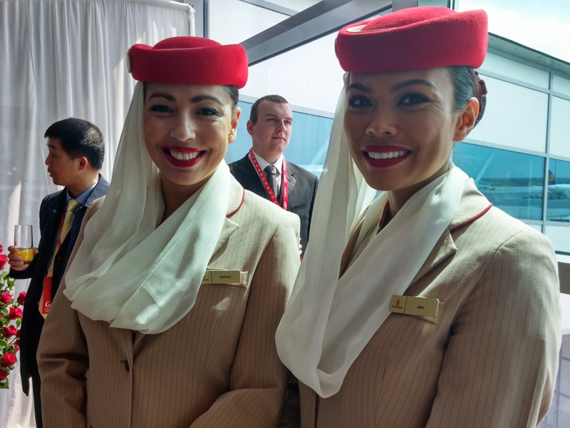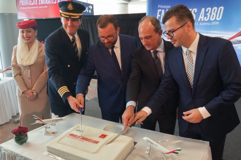 Slavnostní zahájení nasazení A380 na lince Dubaj-Praha. Zleva ředitel Emirates ČR Bořivoj Trejbal, viceprezident Emirates pro Evropu a Rusko Thierry Aucoc a předseda představenstva Českého Aeroholdingu Václav Řehoř. Asistují letušky Emirates.