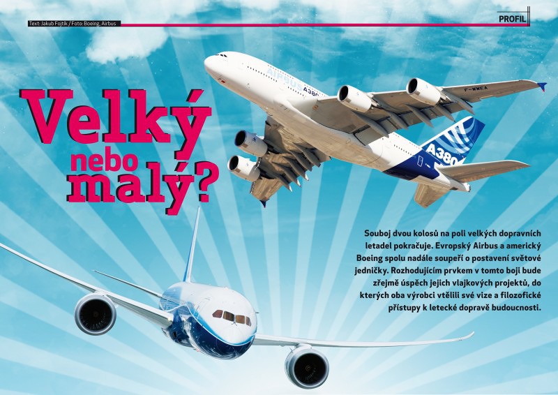 Dva největší výrobci dopravních letadel na světě se po letech obdobné strategie naprosto rozešli. Evropský Airbus vsadil na mamutí A 380, zatímco Boeing dokončuje konvenční, ale po všech stránkách výkonnější B 787 Dreamliner. Oba shodně tvrdí, že jejich letoun je symbolem dopravy v následujících desetiletích.