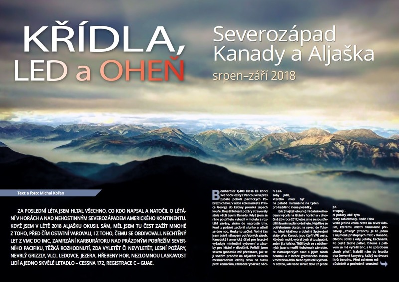 Za poslední léta jsem hltal všechno, co kdo napsal a natočil o létání v horách a nad nehostinným severozápadem amerického kontinentu. Když jsem v létě 2018 Aljašku okusil sám, měl jsem tu čest zažít mnohé z toho, před čím ostatní varovali, i z toho, čemu se obdivovali. Nechtěný let z VMC do IMC, zamrzání karburátoru nad prázdným pobřežím severního Pacifiku, těžká rozhodnutí, zda vyletět či nevyletět, lesní požáry, nevrlý grizzly, vlci, ledovce, jezera, hřebeny hor, nezlomnou laskavost lidí a jedno skvělé letadlo – Cessna 172, registrace C – GUAE.