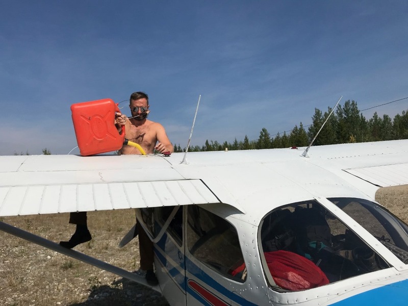 Dilema s palivem za mě vyřešil Eric, a to způsobem „bush pilot“. Naložil nám do letadla dva červené kanystry, každý na dvacet litrů benzínu. Před odletem mě důsledně a podrobně seznámil se všemi způsoby, jak můžeme shořet s palivem na palubě. Svou morbidní exkurzi doplnil několika praktickými radami, jak se tomu vyhnout.