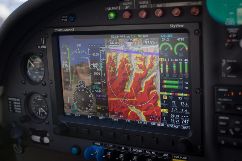 GPS ukazující hory, které jsou výše než my (červená barva) v úzkém údolí, kde nabíráme výšku ve stoupavých kruzích, abychom se přehoupli přes sedlo vedle Grossglockneru.