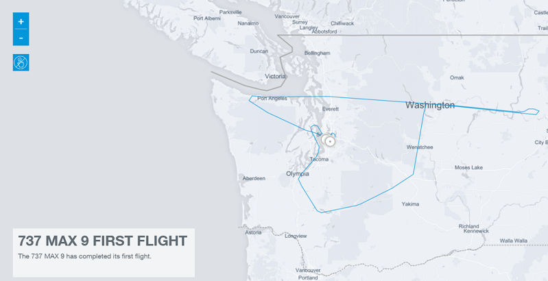 Boeing 737 MAX 9 dokončil svůj první let po půl jedenácté včera večer (čtvrtek 13. dubna 2017) našeho času, resp. po druhé odpoledne místního času. Letoun vzlétl z továrního letiště v Rentonu ve státě Washington, zamířil nad Pugetův záliv, poté přeletěl území státu Washington od západu k východu, aby pod dvou a tři čtvrtě hodinách přistál v Seattlu na Boeing Field.