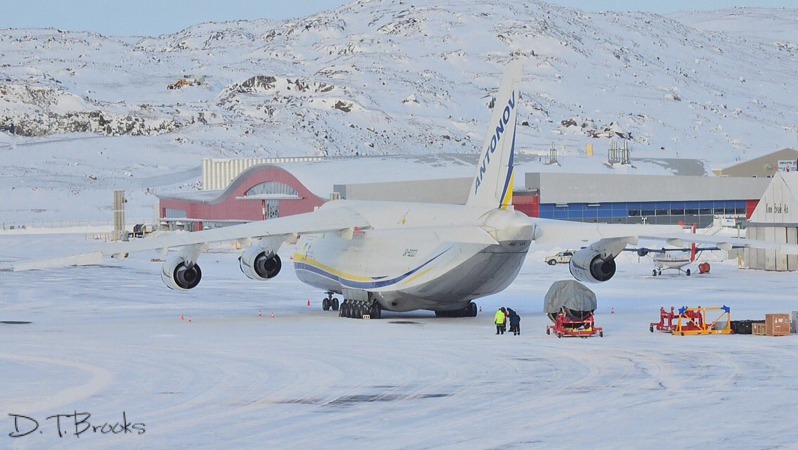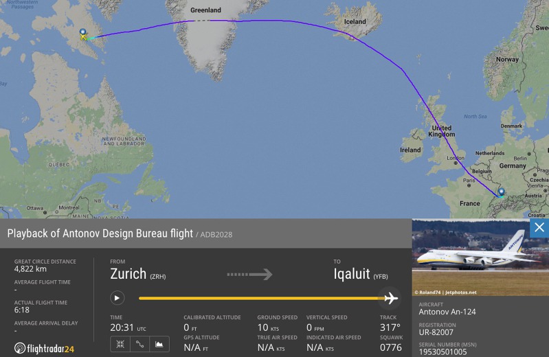 An-124 Ruslan přiváží do Iqaluit pro HB-NJD nový motor. Zdroj: blog.fightradar24.com