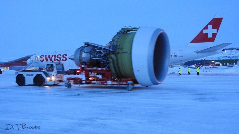Logistici Swiss dokázali něco jako zázrak - třetí den po nouzovém přistání v Iqaluitu byl nový motor GE90 zde. Podařilo se jim totiž domluvit se s Antonov Airlines, odkud poslali jejich An-124 Ruslan do Curychu, zde naložili motor a příslušné vybavení a odletěli s ním do Kanady, kde se technici pustili v mrazivém počasí pod širým nebem do výměny motoru.
