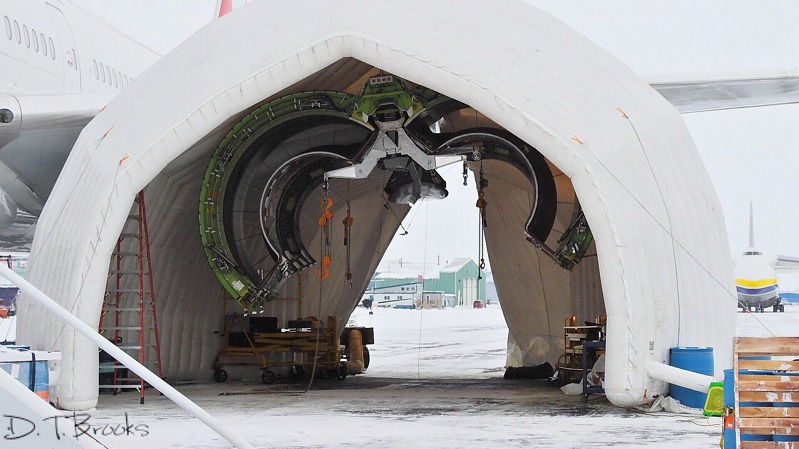 Ačkoli v prostoru uchycení motoru ke křídlu postavili speciální stan, v němž přecejen byla příznivější teplota než venkovních minus 30°C, je třeba smeknout před tím, v jakých podmínkách technici motory úspěšně vyměnili a otestovali.