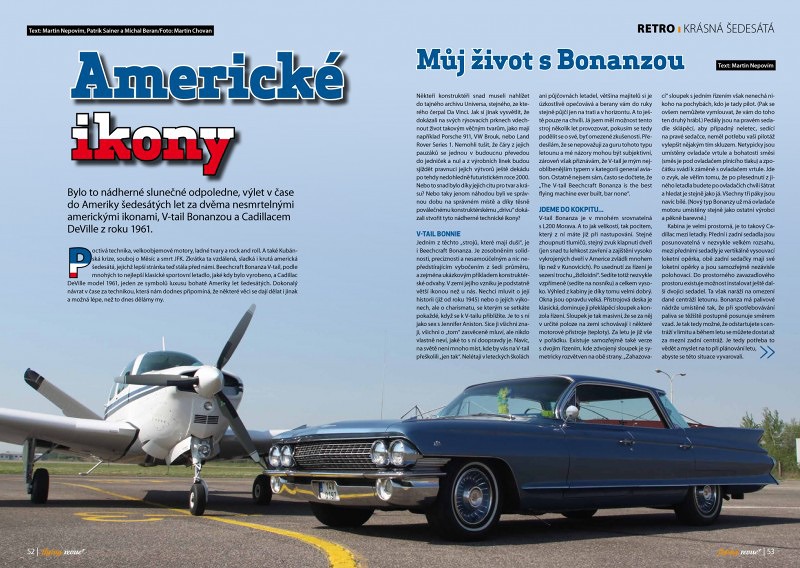 Poctivá technika, velkoobjemové motory, ladné tvary a rock and roll. A také Kubánská krize, souboj o Měsíc a smrt JFK. Zkrátka ta vzdálená, sladká i krutá americká šedesátá, jejichž lepší stránka teď stála před námi. Beechcraft Bonanza V-tail, podle mnohých to nejlepší klasické sportovní letadlo, jaké kdy bylo vyrobeno, a Cadillac DeVille model 1961, jeden ze symbolů luxusu bohaté Ameriky let šedesátých. Dokonalý návrat v čase za technikou, která nám dodnes připomíná, že některé věci se dají dělat i jinak a možná lépe, než to dnes děláme my.