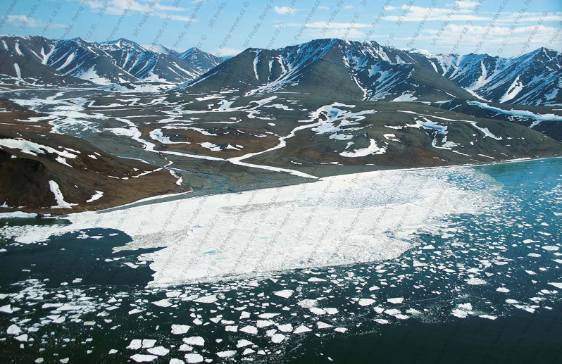 Ledové kry u pobřeží mezi Beringovým průlivem a