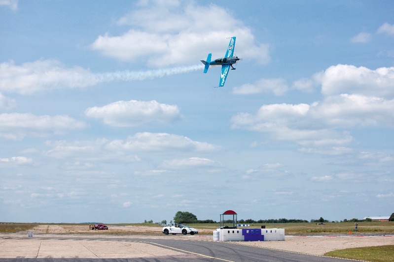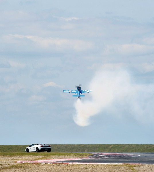 Gallardo LP570-4 Performante je skutečným drsňákem mezi kabriolety. Od rozevřených čelistí masky až po karbonové přítlačné křídlo, prostě tvrďák do morku kostí. Dojem se ještě umocní, když složíte střechu. Jako kdyby si svalovec právě stáhnul triko. A za zvuku svého V10 o objemu 5,2 l, od jehož válečného řevu teď řidiče Lamba v podstatě nic neodděluje, je připraveno vyrazit do boje. Jenomže tentokráte si chlapci od časopisu evo vybrali těžkého soupeře. Možná si na bedfordském autodromu, který je jejich domácí testovací tratí, věří, ale dnes bude jejich zástupce Roger Green soupeřit s dravcem ve vzduchu. Dvoumístná Extra 300 LP s šestiválcovým Lycomingem AEI0-540, řízená bývalým pilotem Red Arrows a dnes vedoucím pilotem akrobatické skupiny The Blades, bude tvrdým oříškem. Myles Garland má za sebou kariéru pilota Harrieru v RAF a také tříleté působení ve slavných Red Arrows, kde létal jako „synchro leader“, jinými slovy, jeden z dvojice pilotů, kteří se před vámi na sebe řítí rychlostí téměř 1300 km/h a pak se minou ve vzdálenosti několika metrů. A tohle je Mylesův popis tohoto bláznivého souboje.