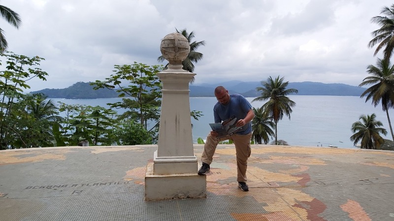 Tomáš Zach s Flying Revue na místě, kde se protíná rovník s nultým poledníkem na ostrůvku Ilhéu Das Rolas v Guinejském zálivu.