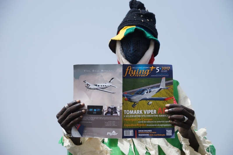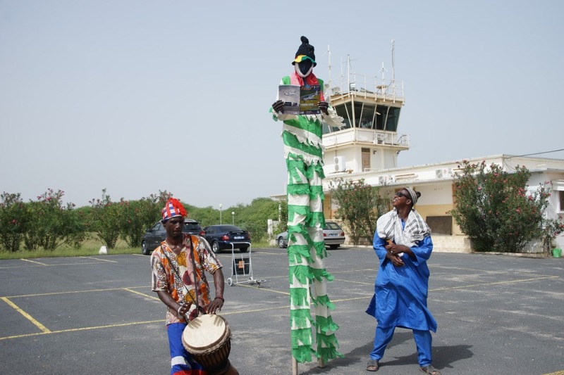 Skupina kejklířů na letišti St Louis vítající účastníky rallye Toulous – St. Louis, Senegal, září 2017