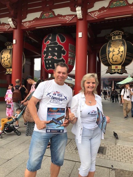 Po příletu do Chiby vzali Stanislav a Klára FR na promenádu po městě. Už jsme několik Japonců přesvědčili, komu mají fandit, připsal k ní Stanislav. Foto: Archiv S. Plášila