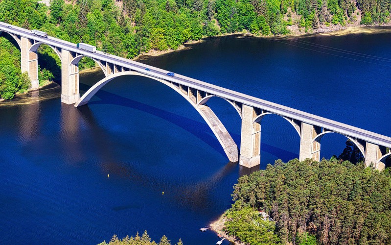 Železobetonový Podolský most překlenuje údolí Vltavy mezi obcemi Temšvár a Podolí. Foto: Tomáš Vocelka