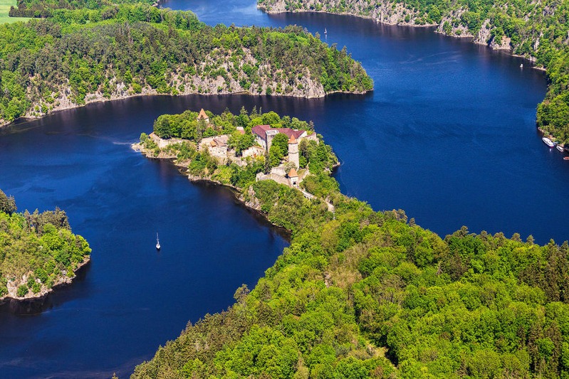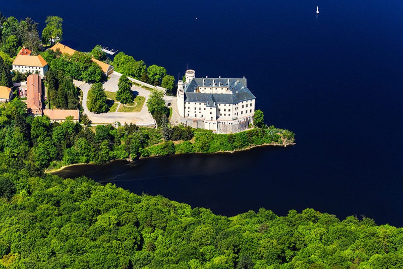 Zámek Orlík, patřící Schwarzenbergům, stával na skalnatém ostrohu vysoko nad Vltavou, dnes leží na břehu přehrady. Foto: Tomáš Vocelka