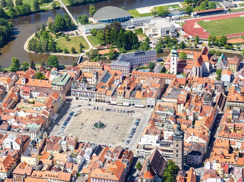 České Budějovice. Za náměstím je vidět místo, kde se setkává Vltava s Malší. Foto: Tomáš Vocelka, Aktuálně.cz