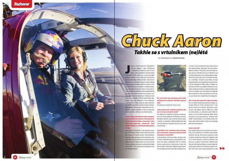 Jednou z hvězd letošních odpoledních letových ukázek v rámci AirVenture v Oshkoshi byl bezesporu opět Chuck Aaron, pilot speciálního akrobatického vrtulníku BO-105. Vidět totiž vrtulník provádět přemet či sudový výkrut stále není zcela běžné, čemuž odpovídaly i reakce publika. Chuck Aaron létá se svým vrtulníkem již pátým rokem, stále je však ve Spojených státech jediným pilotem, který drží FAA licenci pro provádění vrtulníkové akrobacie při leteckých dnech. Než se Chuck stal pilotem společnosti Red Bull, nashromáždil desítky tisíce letových hodin na snad všech typech vrtulníků, jaké si je možné představit. Práškoval s nimi pole, létal v armádě, ve filmech jako letecký kaskadér či jen nad přeplněnými komunikacemi v roli dopravní hlídky. Létal ale i jako zaměstnanec NASA v roli šéfa vrtulníkové sekce záchranného systému při startech raketoplánů na Floridě. Pro armádu pomáhal vyvinout a odzkoušet systém nočního vidění vrtulníkové piloty.