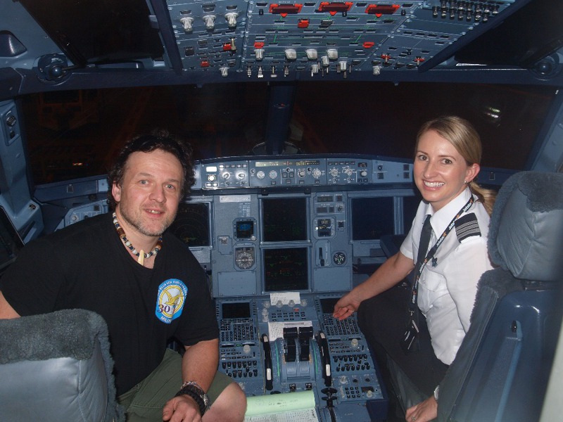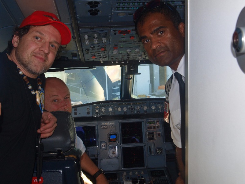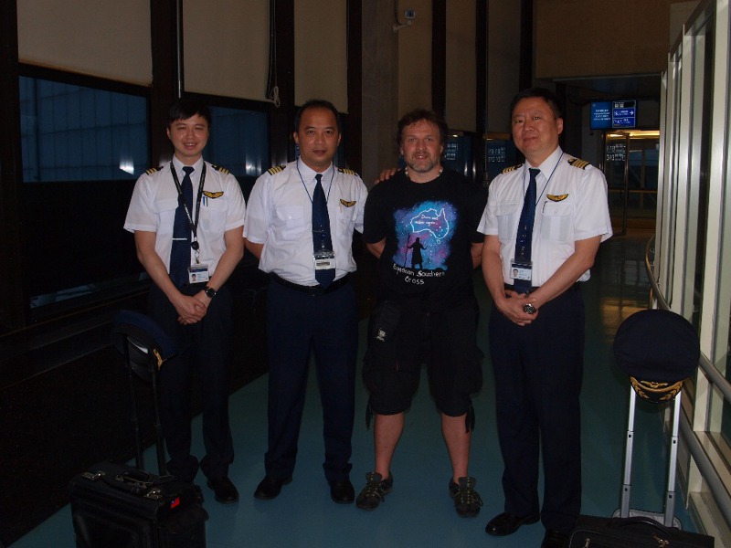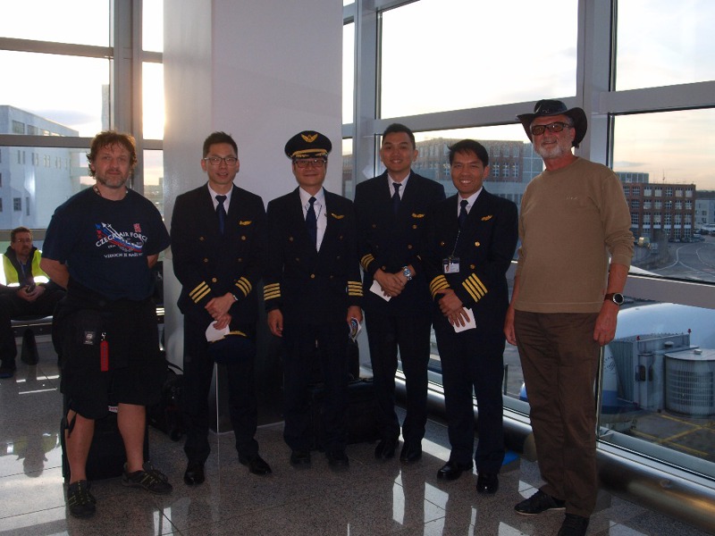 Však jsme také po přistání využili příležitosti a kapitánovi i celé posádce vyjádřili náš obdiv a poděkování. Jakož i letuškám za jejich milé úsměvy a skvěle odvedenou práci. I tato posádka dostala od nás na památku klubové a svazové samolepky. Mimochodem - právě začalo vycházet slunce. Dnes už podruhé!