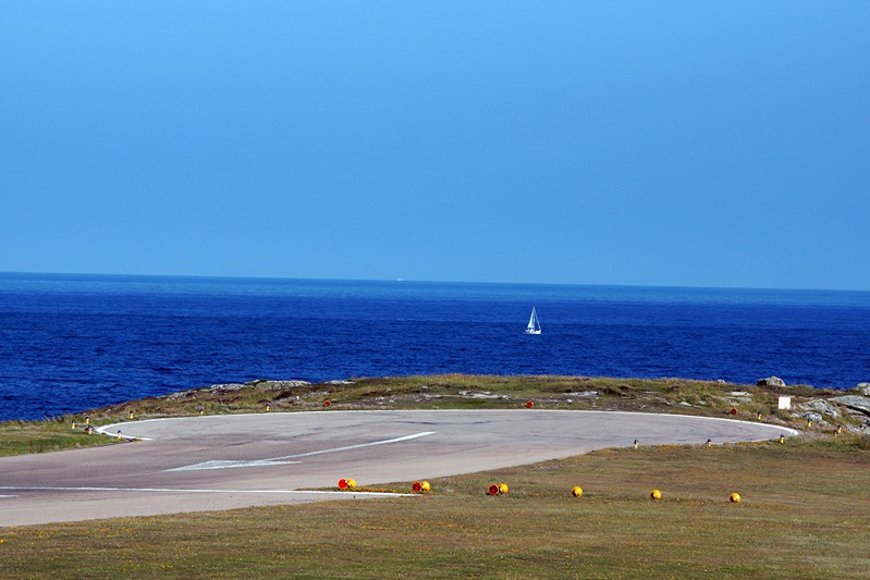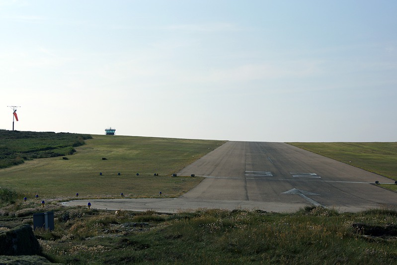 Půlka letištní dráhy stoupá a druhá klesá. Zde práh dráhy 32 focený od moře
