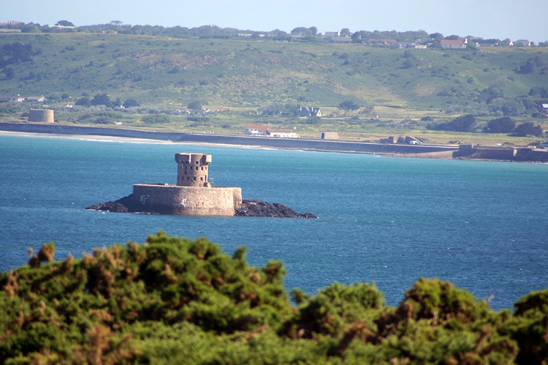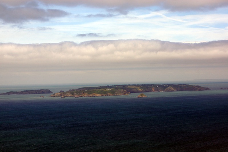 Pohled ukazující tři ostrovy – nejblíže je Guernsey, další je Sark a nejvzdálenější je Jersey