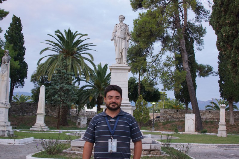 Můj průvodce (také Jorgos) po památném hřbitově Messolonghi. Za ním pomník lordu Byronovi