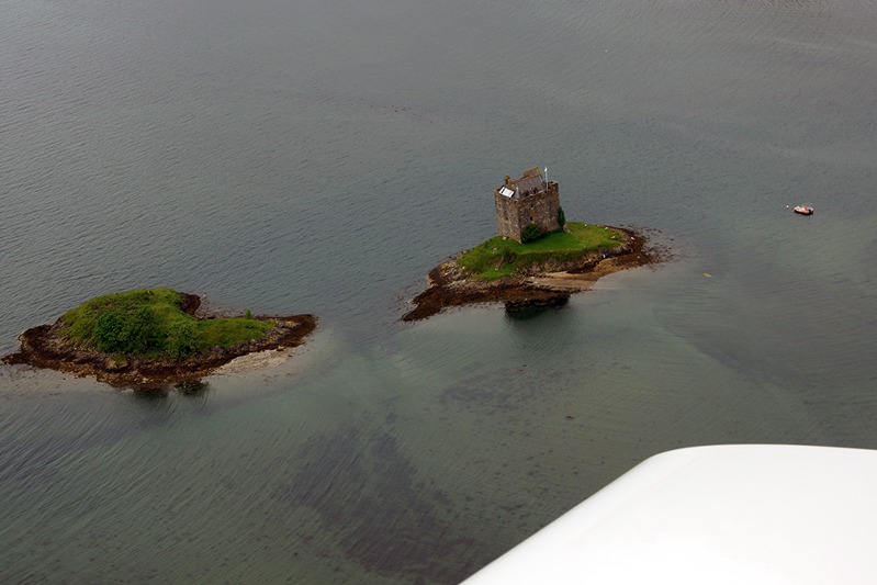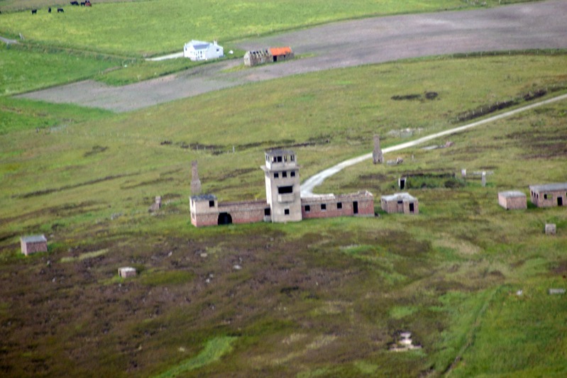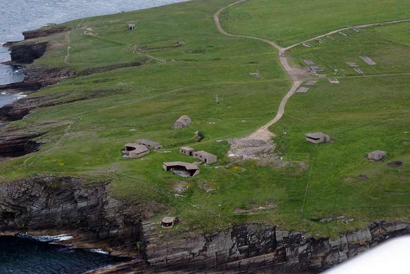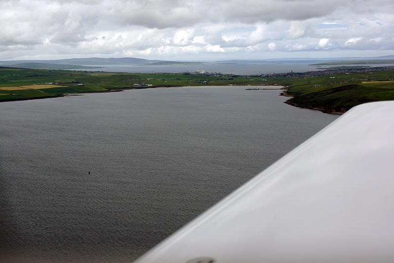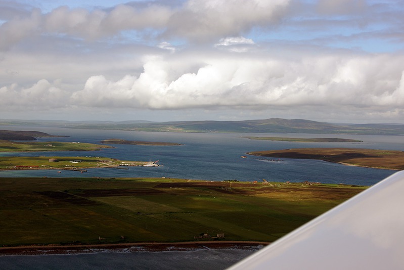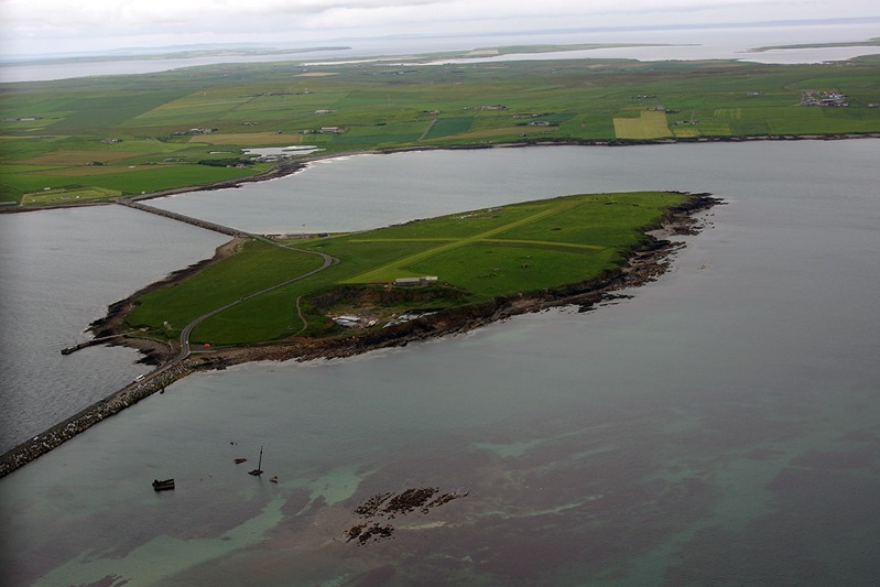 Ostrůvek Lamb Hom, Orkneje – vlevo nahoře je Churchillova hráz číslo 1, kudy do Scapa Flow v říjnu  1939 vplula německá ponorka, která následně potopila britskou válečnou loď Royal Oak s níž   zahynulo i 833 britských vojáků. Na ostrůvku jsou zřetelně viditelné přistávací dráhy soukromého   letiště, kde jsem přistál.