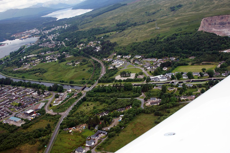 Jezero Loch Ail, vpravo Kaledonský kanál s Neptunovým schodištěm