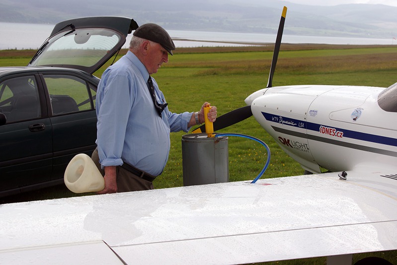 David s jeho chloubou – pumpou na baterii – přečerpává benzín do letadla.