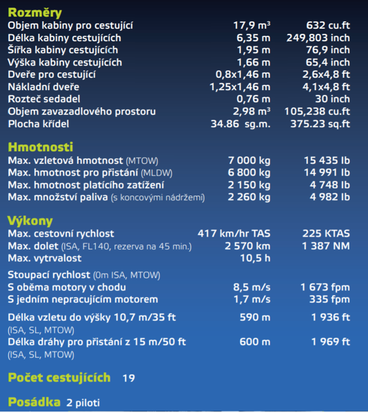 | Max. dolet (ISA, rezerva na 45 min) | 2 630 km | 1 418 NM |