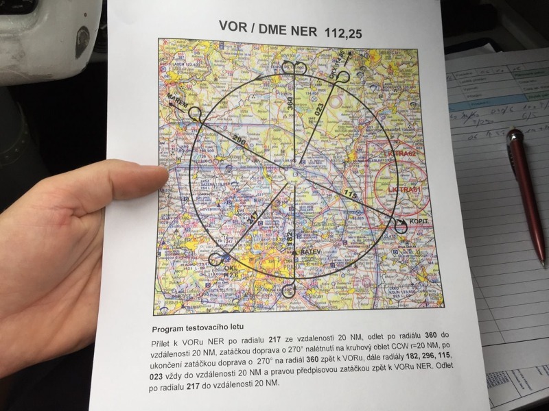 V  5000 ft jsme se dostali do vrstvy mezi oblačností. Jsme rádi alespoň za ten nepatrný výhled. Po nalétnutí VOR NER po radiálu 217° následuje odlet po radiálu 360° kamsi k České Lípě. Na  severu od  Prahy se spodní vrstva oblačnosti tu a tam protrhává, nás ale stejně více zajímá to, co ukazuje kalibrační sytém. Kružnice ve vzdálenosti 20 NM okolo VOR vede mezi letišti Roudnice a Sazená, ale také opět nad letištěm Ruzyně a pokračuje přes prostory TRA 61 a TRA 62 zpět k České Lípě. Pak ještě 4x tam a zpátky od VOR NER a zase k němu.