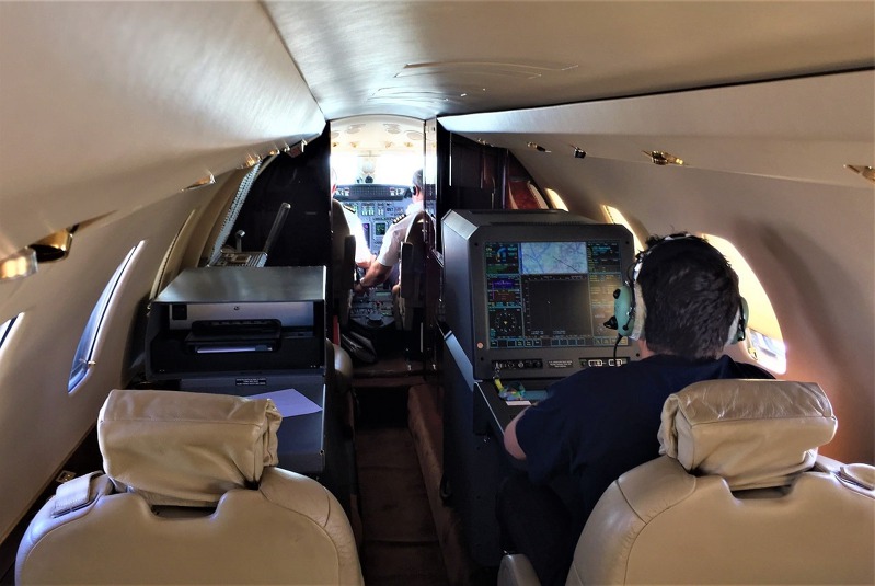 Pohled do kabiny kalibrační Cessny Citation 560 XL s přístrojovým vybavením pro kalibrační lety.