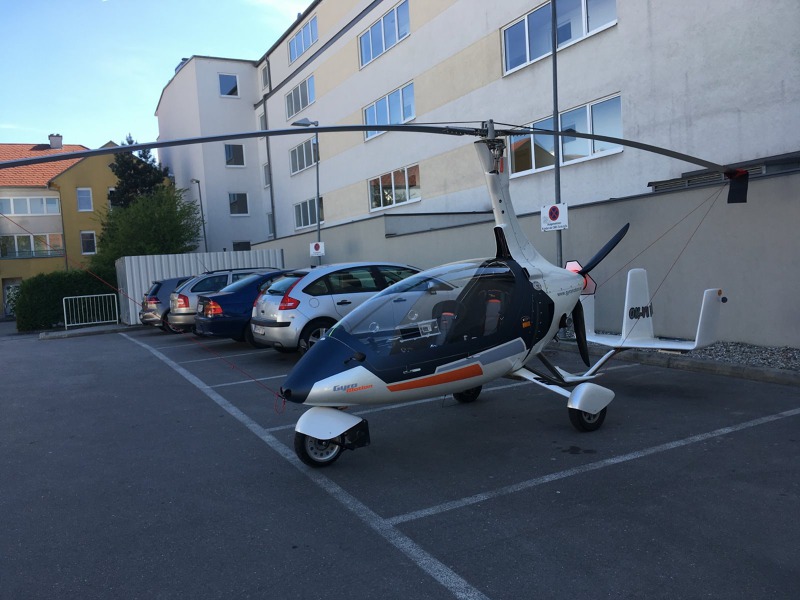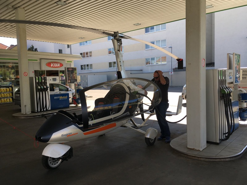 Návrat z města - vše bez problémů včetně tankování u čerpací stanice ve městě. Potvrdilo se tedy vše - že lze ultralightem bez problémů letět do Rakouska bez složité byrokracie i to, že vírník GyroMotion může bez obav legálně jezdit po silnici nejen v Česku, ale i v Rakousku. Foto: Jindřich Ilem