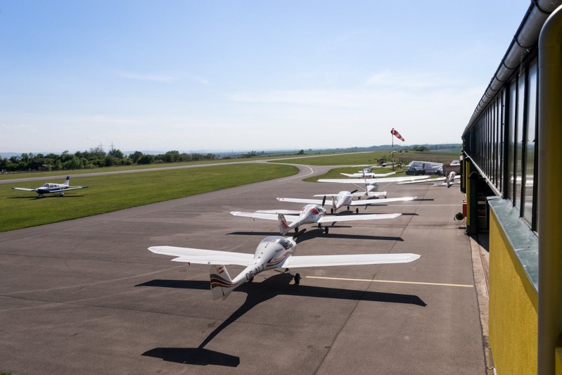 Letiště v dolnorakouském městečku Stockerau má 796 m dlouhou, kvalitní asfaltovou dráhu (v pozadí), zde vidíme domácí letouny seřazené u hangáru. Foto: Jindřich Ilem