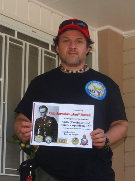 Pamětní deska plk. Jaroslavu Novákovi, kterou autoři článku přivezli do Austrálie.