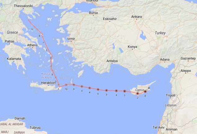 Mezi Krétou a Kyprem nebyl prakticky žádný vítr, a tak jsem letěl většinu cesty rychlosti 250 – 260 km/h. V 16 hodin a 8 minut jsem sedl v Larnace. Tady jsme okamžitě natankovali dalších 180 litrů paliva na pondělní cestu do Ryiadu a můj kyperský kamarád mě odvezl do hotelu.