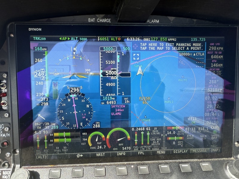 I když jsme byli na pasové kontrole jen dva, tak trvala asi 15 minut, protože pilot přede mnou měl něco komplikovaného s čím si mladý pasový úředník neuměl dlouho poradit. Když jsem pak nastupoval do auta, bylo již asi 8.25 a můj letový plán byl po předsunutí na 8.30. Letadlo stálo na té nejvzdálenější stojánce, a tak jsme k němu dorazili asi v 8.35. Na přípravu jsem potřeboval asi 10 minut, a tak jsem v 8.45 požádal o povolení nahodit motor a vzápětí také o povolení pojíždět. Na ATISu jsem zároveň také zjistil, že dráha v používání je 12, což znamenalo, že ztratím dalších 8-10 minut po vzletu nutností se otočit a letět pak zase zpět, abych se dostal na svou trasu ve směru cca 290 stupňů.