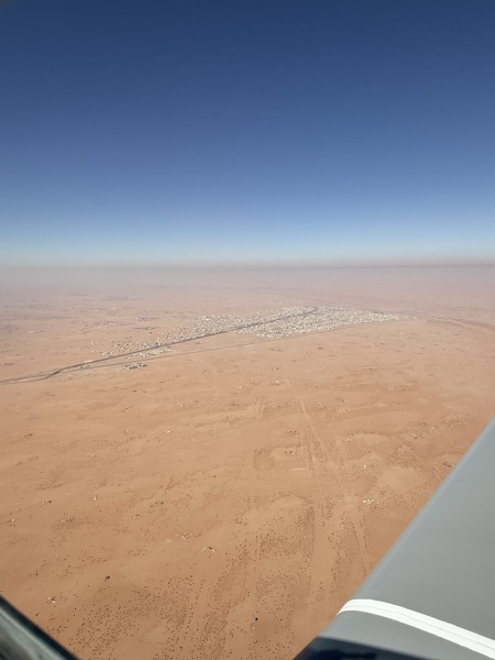 Situace se začala trochu měnit, když jsem se po asi 15 minutách letu konečně dostal na svou trať a nad moře. Foukal asi 30 km/h boční vítr s asi 5 km zadní složkou. Dal jsem plný plyn, maximální povolené otáčky a rychlost proti zemi se usadila na 285 km/h. Kalkulovaný čas na přistání se ustálil na 11.54, což mi dalo naději. Kdosi z cílového letiště mi ještě poslal sms zprávu, ať letím co nejrychleji, protože po dvanácté hodině mi už nedovolí přistát. Nevím, zda mě chtěl jen znervóznit nebo myslel, že mě svou zprávou zrychlí. Ke zrychlení nedošlo a k zamezení nervozity jsem zprávu prostě ignoroval. Během letu nad Perským zálivem jsem postupně u jednotlivých řídících vyprosil vynechání několika navigačních bodů, což mi zkrátilo cestu asi o 20 minut. Po té, co jsem se dostal zpět nad pevninu a změnil směr více na západ, nabrala složka zadního větru trochu na síle, a já jsem letěl proti zemi kolem 300 km/h. Když jsem pak ještě vyřešil chybu ve své databázi, která uvádí pro cílové letiště špatnou frekvenci, tak jsem požádal o povolení k přistání. Bylo 11.30 (v Saudské Arábii je o hodinu méně než v Dubaji) a já jsem byl na finále, které mi řídící ještě trochu vylepšil tím, když mě informoval, že 400 metrů od prahu dráhy je natažené brzdící lano pro stíhačku nacvičující jeho zachycení pro přistávání na letadlové lodi. Dosedl jsem a asi 300 metrů za prahem jsem už dráhu uvolnil, takže lanu jsem se vyhnul.