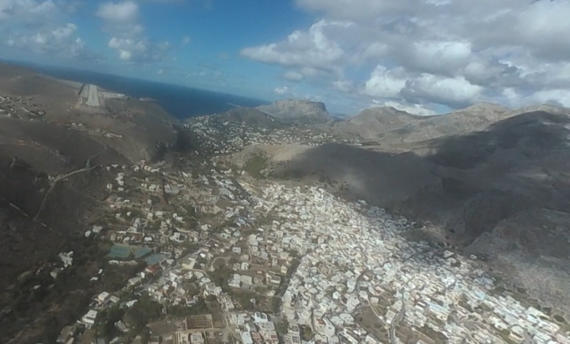Dráha letiště Kolymnos leží v horském úbočí nad městem