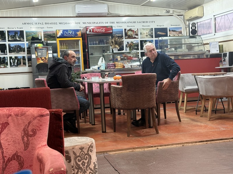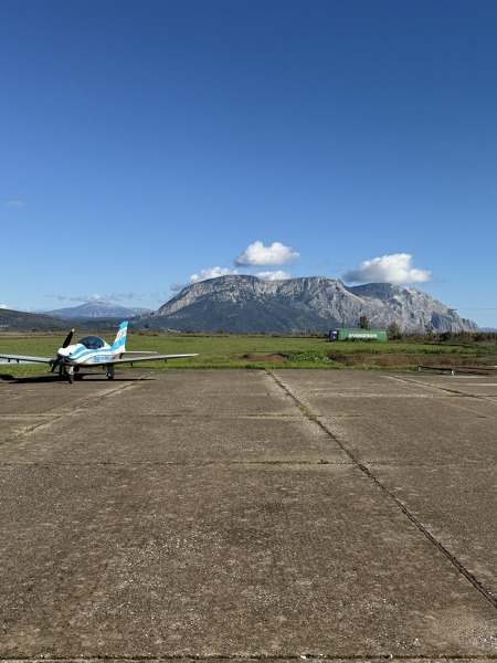 Následně jsem se vydal směrem k letišti Kozani, kde se mi podařilo domluvit letmé přistání a pak totéž na letišti Kastoria než jsem se stočil na jih směrem k mému oblíbenému letišti Messolonghi, kde jsem byl domluvený se svým dnes už kamarádem, generálem řeckého letectva ve výslužbě, Jorgosem. Tenhle skoro osmdesátiletý generál, který má za sebou 2500 hodin ve strojích F104, byl 4 roky starostou historického města Messolonghi a posledních asi 10 let provozuje stejnojmenné letiště, dělá i nyní leteckého instruktora. Kdykoliv sem přiletím, tak mi pomůže přivézt palivo, najít hotel a vždycky máme o čem mluvit. Tentokrát jsem mu přivezl novou knihu Na limit, ve které jsou i jeho fotografie.