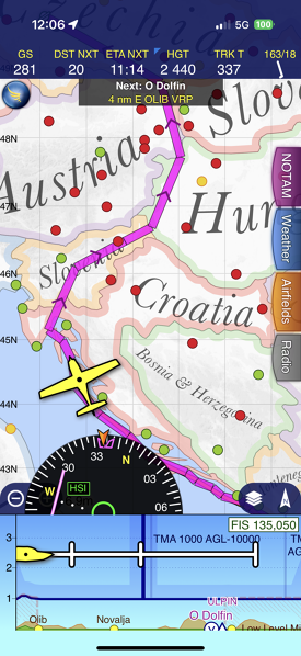 Durres, Ulcinj, Tivat, Dubrovnik, Hvar, Brač, Split, Zadar – hezké pobřeží, malebné ostrovy… U Zadaru jsem se dostal do těžkého deště a nedaleko se taky párkrát zablesklo. Sklesal jsem na 1500 stop, abych viděl na hladinu a pokračoval jsem. Pak se na chvíli udělalo zase hezky. Toho jsem využil a začal jsem studovat čerstvé metary, které stahoval SkyDemon vždy při přeletu nějakého ostrova. Severně od Lublaně až do Prahy nebylo jediné otevřené letiště a situace se nezlepšovala ani s postupujícím časem.