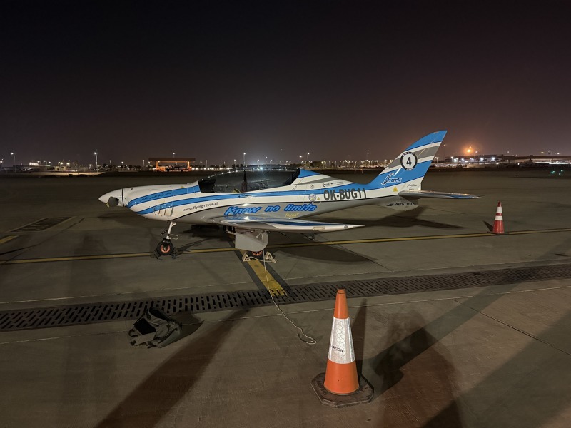 S uklidněným větrem se moje rychlost zvýšila na 260-270 km/h a já jsem začínal věřit, že palivo mi vystačí, protože součet uletěné doby letu a té ještě přede mnou, vycházel už dost stabilně na 10 hodin. Palivo bylo tedy už celkem v pořádku, ale problém byl s časem. Začalo být jasné, že k Rijádu přiletím až po západu slunce. Moje cílové letiště je ale mezinárodní letiště přibližně dvakrát větší než Praha, a tak jsem se neobával, že ho nenajdu. Letiště má dvě paralelní dráhy a já jsem se ze západu blížil k té levé a věřil jsem, že mě na ní nechají přistát. Kvůli provozu ale řídící rozhodl jinak, a tak mě poslal nad střed města a pak zase zpět, aby mě mohl nechat přistát na dráze pravé. Objevovat taje mezinárodního megaletiště po desetihodinovém letu a ještě bez denního světla, je docela vyšťavující, a tak jsem měl radost, když jsem po celkem 10 hodinách a 15 minutách letu konečně přistál. Na zemi pak už probíhalo vše standardním způsobem a já jsem se kolem sedmé večer konečně dostal do sprchy.