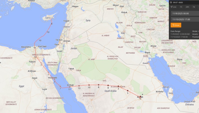 Tady je vidět zbytečný „zálet“ příliš na západ, který jsem musel na přání řídícího odletět přesně tak, jak mi ho egyptské úřady schválily. To mě stálo zbytečně asi 15 minut letuZoom gallery
