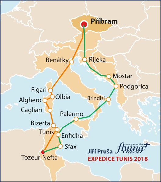 Expedici do Tuniska jsem naplánoval na druhou polovinu září 2018. Měl jsem k dispozici 10 dní, a tak jsem se snažil připravit co nejjednodušší a nejkratší trasu. Letět do Tuniska není vlastně navigačně nijak komplikované – stačí od nás letět pořád na jih.