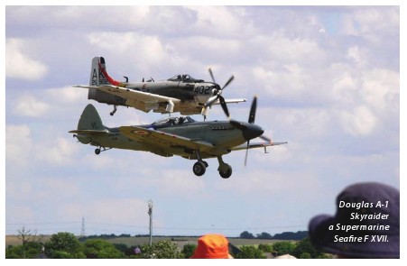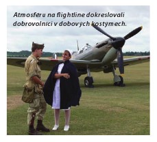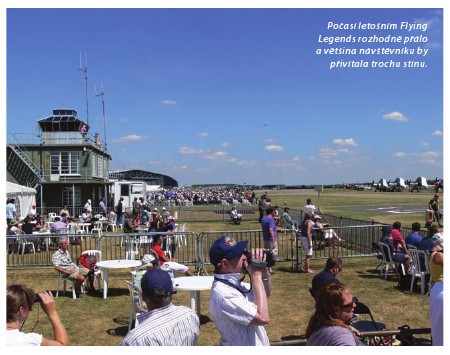 Tropické horko, které zasáhlo Britské ostrovy o tomto víkendu, činí pobyt na rozpáleném letišti poněkud únavným. Blíží se druhá hodina, oficiální začátek leteckého dne a na rozpálené ploše duxfordského letiště burácí deset motorů Rolls-Royce. Už jen průjezd osmi Spitfirů, Hurricanu a Buchonu při pojíždění na start byl nezapomenutelným zážitkem a našinec uvyklý běžným leteckým dnům očekává postupný, „katolický“ start s dostatečnými rozestupy. Jenomže Spity se řadí do sevřených trojic a úderem druhé dává letecký maršál Clifford Spink, sedící v kabině vedoucího Spitfiru, pokyn ke startu. Řev osmi motorů naplňuje letiště a Spitfiry startují ve trojicích křídlo na křídle. Takhle nějak je stíhači zvedali do vzduchu před sedmdesáti lety a tahle scéna útočí na lidskou mysl všemi smysly. Mrazí z toho trochu v zádech, a tak po očku pozoruji kolemstojící, zda jsem tady za blázna jen já. Nejsem. A vsadil bych se, že prošedivělému muži stojícímu kousek ode mne se v koutku oka zatřpytila slza. Myslel jsem, že jsou tady, co se týče warbirdů, zvyklí na ledacos, ale tenhle okamžik má zvláštní kouzlo. Po tomto fantastickém začátku už následující hromadná honička Spitfirů po obloze nad Duxfordem ani nepřekvapí.
