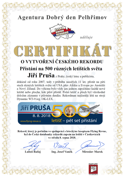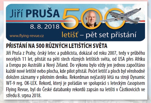 500 letišť Jiřího Pruši V srpnu 2018 zaregistrovala pelhřimovská agentura Dobrý den přistání českého letece a publicisty Jiřího Pruši na pětistém letišti světa, nyní vychází šesté vydání České knihy rekordů, kde je uveden i tento zápis.