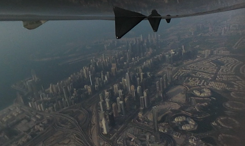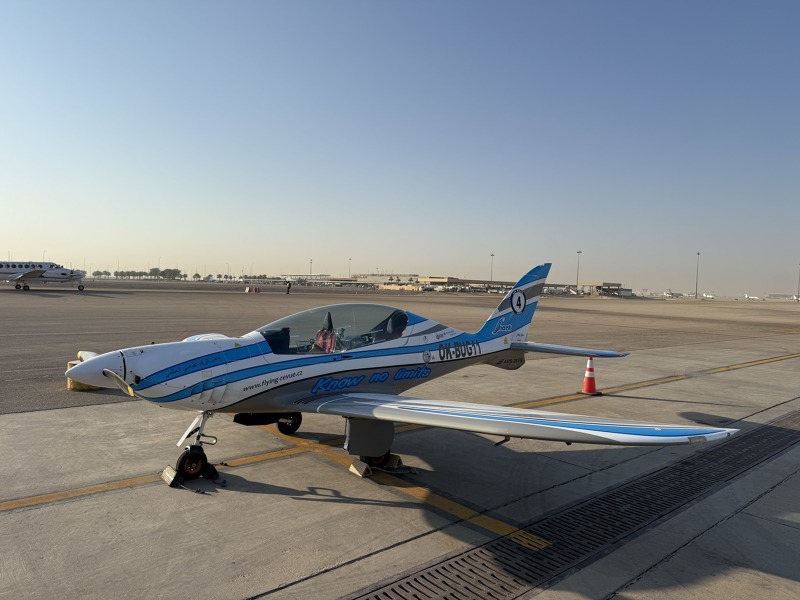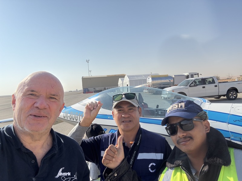 Dubaj má o hodinu víc než Rijád, a tak jsem tu šel na přistání asi v půl čtvrté. Přestože svítilo slunce a počasí bylo skvělé, dráhu jsem ve smogu viděl až při přiblížení na nějakých 6 kilometrů. Vše se zdálo být v pořádku a já jsem následoval Follow-me auto, které mě zavedlo do části vyhražené pro leteckou výstavu Dubai Air Show 2025. Tady mě auto opustilo a já jsem jen bezradně čekal asi půl hodiny, než ke mně přišel nějaký člověk s telefonem. Ten telefon mi předal a já jsem se od člověka na druhé straně spojení dověděl, že organizátorovi se nelíbí můj pojistný certifikát, a tak že musím zůstat mimo výstaviště. Byl jsem spokojený, že jsem konečně v Dubaji na zemi, a tak mě to nijak moc nerozrušilo. Zavolal jsem Honzovi Gazdečkovi do Prahy a ten to slíbil vyřešit, chybělo tam prý jen nějaké razítko. Ani ne po další hodině ke mně přijelo auto a jeho řidič mi oznámil, že vše je už v pořádku, já si mohu vzít svoje věci a oni, že pak letadlo odvezou do výstavního areálu a postaví na místo. Já jsem pak prošel pasovou kontrolou a byl konečně v Dubaji.